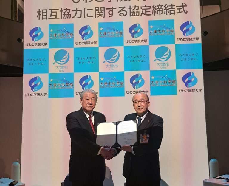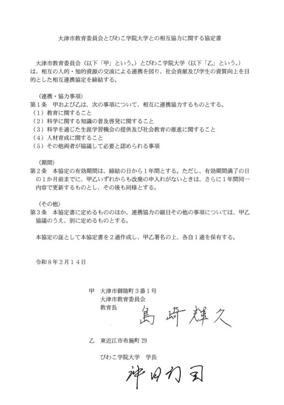 2026年2月14日(土)、大津市教育委員会とびわこ学院大学は、科学に関する知識の普及啓発をはじめ、教育および人材育成の分野で連携・協力を図るため、「相互協力に関する協定」を締結しました。